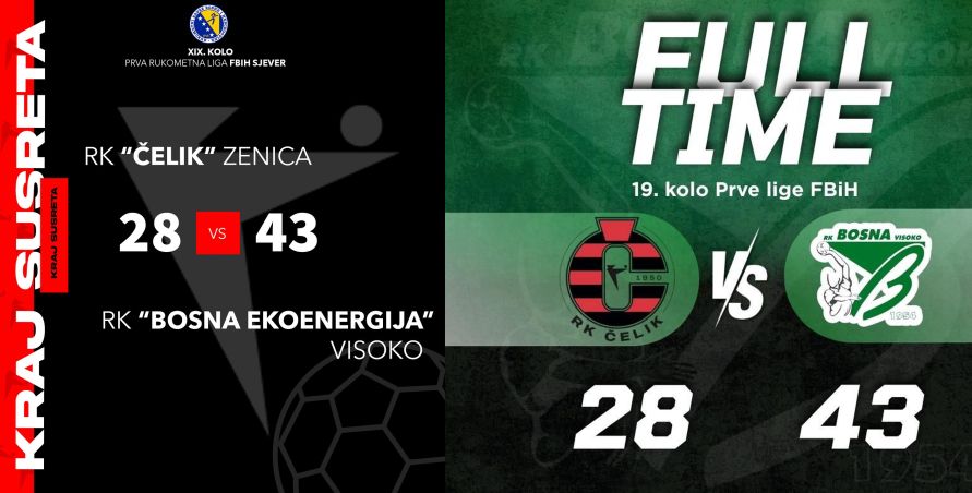 RK Čelik pružio jak otpor: RK Bosna Ekoenergija Visoko slavila u Zenici- U 19. kolu Prve lige Federacije BiH, rukometaši visočke Bosne ostvarili su ubjedljivu pobjedu protiv RK Čelik u Zenici rezultatom 28:43 (16:22).