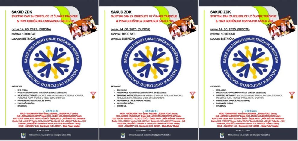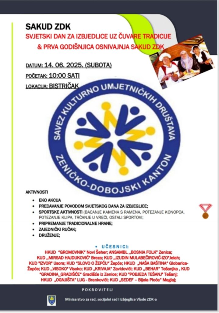 U subotu, 14. juna 2025. godine, na izletištu Bistričak kod Zenice bit će održana manifestacija kojom Savez kulturno-umjetničkih društava Zeničko-dobojskog kantona (SAKUD ZDK) obilježava Svjetski dan za izbjeglice, ali i prvu godišnjicu svog osnivanja.