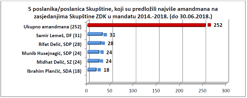 Tokom trajanja mandata, postavio sam 42 poslanička pitanja na koja sam dobio 8 odgovora, podnio 10 inicijativa od kojih je samo jedna prihvaćena i realizirana, predložio 7 zaključaka od kojih je jedan usvojen i imao sam skoro 200 diskusija na 74 zasjedanja Skupštine.