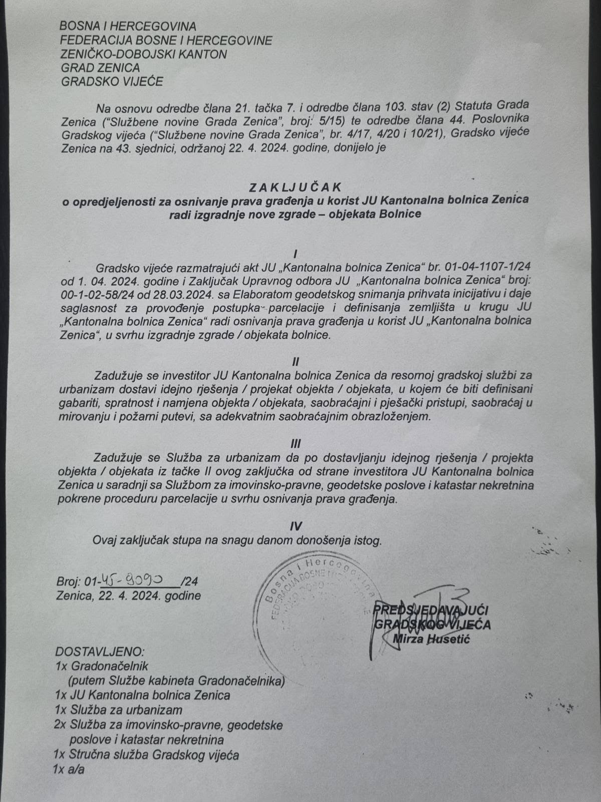 Sa mnom pregovaraju da kupe kompletnu bolnicu, a javnosti prodaju priču da bi pravili novu bolnicu. Evo dokumenta – još u aprilu ove godine, Gradsko vijeće Zenice donijelo je Zaključak o opredijeljenosti za osnivanje prava građenja u korist JU Kantonalna bolnica Zenica radi izgradnje nove zgrade – objekata bolnice.