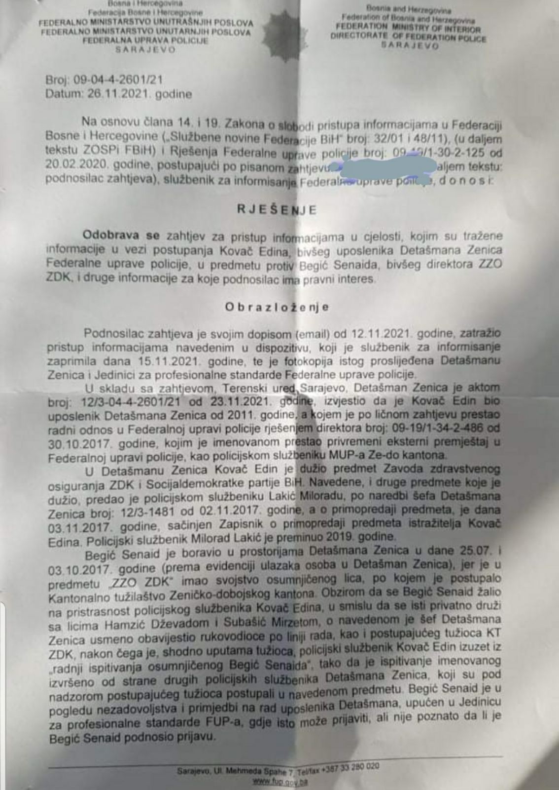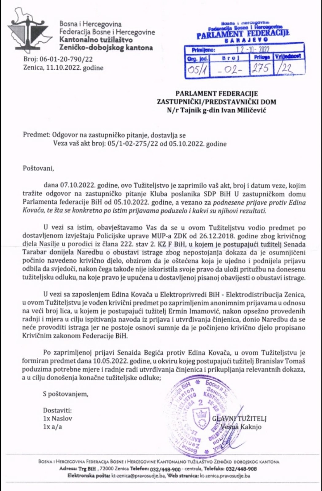 Parlamentu Federacije BiH je 12.10.2022.g.dostavljen odgovor Tužilastva ZDK broj. 06-01-20-790/22 od 11.10.2022.g. u kojem je između ostalog navedeno da se u Tužilaštvu ZDK vodio predmet protiv Edina Kovača po dostavljenom izvještaju Policijske uprave MUP-a ZDK od 26.12.2018.g. zbog krivičnog djela Nasilje u porodici iz člana 222.stav 2.KZ F BiH kao i krivični predmet u vezi zaposlenja Edina Kovača u EP BiH-Elektrodistribucija Zenica,a na osnovu zaprimljenih anonimnih prijava u odnosu na veći broj lica.U oba navedena slučaja , postupajući tužitelji Senada Tarabar i Ermin Imamović su donijeli Naredbu da se neće provoditi istraga.