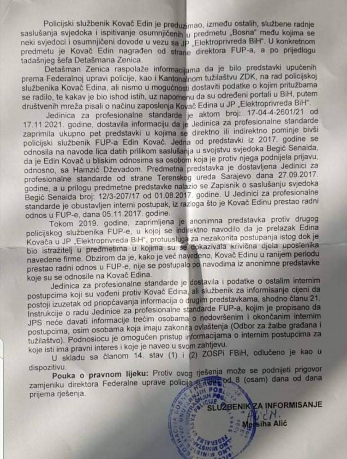 Krivičnom prijavom od 15.04.2022.g.bivši inspektor FUP-a, a danas uposlenik JP Elektrodistribucija Zenica je, uz veliki broj dokaza i izjave nekoliko svjedoka optužen da je obavljajući službenu dužnost istražitelja MUP-a F BiH, Detašman Zenica , u period od marta 2016.g.do oktobra 2017.g. „montirao predmet“ protiv Senaida Begića, bivšeg direktora ZZO ZDK. Izvještaj koji je službeno vodio i potpisao inspektor Kovač je doveo do sudskih procesa u kojima je kasnije Begić pravomoćno osudjen. U prilog krivičnoj prijavi izmedju ostalih dokaza bio je i službeni akt FUP-a br.09-04-4-2601/21 od 26.11.2021.g.u kojem su navedene informacije i dokazi da je Jedinica za profesionalne standarde FUP-a zaprimila ukupno pet predstavki protiv Edina Kovača . (2.Dokaz u prilogu ,Akt FUP-a br.09-04-4-2601/21 od 26.11.2021.g.).