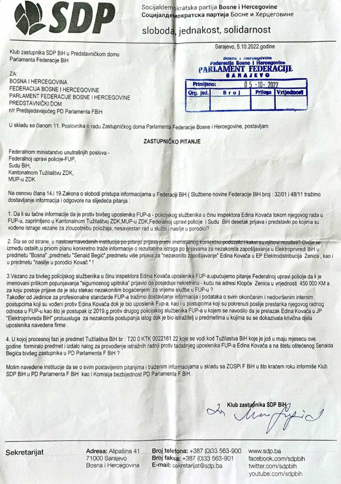 Obzirom da se osim formiranja predmeta u Tužilaštvu BiH već više od pola godine stvari,skoro pa nisu pomjerile sa ,,mrtve tačke,, Klub SDP BiH u PD Parlamenta F BiH je prije nekoliko dana na poslednjem zasjedanju Parlamenta prema nadležnim institucijama kao što su Sud BiH, FUP, MUP ZDK i Tužilastvo ZDK, aktom br 05/1-02-275/22 od 05.10.2022.g. uputio nekoliko poslaničkih pitanja vezano za predmet i prijave protiv bivšeg inspektora FUP-a Edina Kovača, a čiji odgovori osim zastupnicima, trebaju biti dostavljeni i Komisiji za bezbjednost PD Parlamenta F BiH, a sve sa ciljem da se predmet ubrza i da javnost dobije odgovore na mnoga pitanja u vezi rada i djelovanja Edina Kovača, a posebno njegovog direktnog uticaja u predmetu ,,montiranja procesa,, protiv Senaida Begića inače bivšeg zastupnika u PD Parlamenta F BiH kojem je upravo zbog predmeta koji je vodio Kovač a koji je doveo do pravosnažne presude, CIK u junu 2021.g oduzeo zastupnički mandat . ( 3.Dokaz u prilogu Akt Poslanička pitanja Kluba SDP BiH br 05/1-02-275/22 od 05.10.2022.g.).