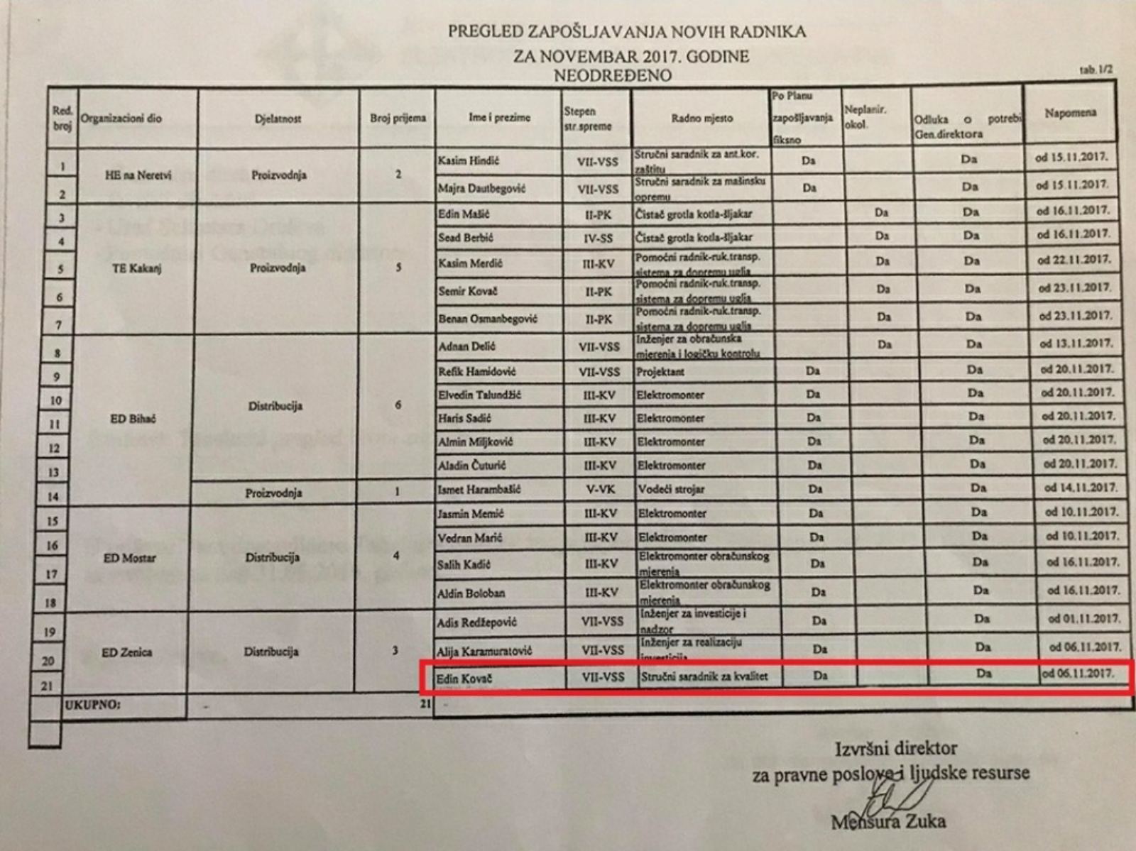 Naime, tužilac Tužilastva ZDK Branislav Tomaš je otac od bivšeg inspektora FUP-a Slavena Tomaša, inače dugogodišnjeg radnog kolege i prijatelja bivšeg inspektora FUP-a Edina Kovača. Edin Kovač i Slaven Tomaš su tokom 2016.g . kao ovlaštena službena lica iz FUP-a provodili istragu, ispitivali svjedoke i optužene, te potpisivali zapisnike u predmetu krivičnog djela nezakonitog zapošljavanja u Elektroprivredi BiH, primanja dara ili drugih oblika koristi za trgovinu uticajem koji je široj javnosti u BiH poznat kao „predmet Bosna“, a koji je doveo do sudskih procesa i presuda Amiru Zukiću i ostalima iz grupe oko njega o čemu su mediji u BiH često izvještavali javnost. Također u tim izvještavanjima se pojavila informacija sa dokazima da je upravo u Elektroprivredu BiH u maju 2016.g. na posao referenta za naplatu, na određeno vrijeme zaposlena Sanda Alispahić, rođena Tomaš inače sestra inspektora Slavena Tomaša . Sanda Alispahić, rođena Tomaš je kćerka tužioca Tužiteljstva ZDK Branislava Tomaša . Ono što je u svemu čudna koincidencija je da je godinu dana poslije, tačnije 06.11.2017.g. u stalni radni odnos na posao stručnog saradnika za kvalitet primljen i bivši FUP-ovac Edin Kovač. Još jedna koincidencija je da je Kovač primljen u radni odnos u Elektrodistribuciju Zenica samo nekoliko dana po okončanju svog poslednjeg predmeta u FUP-u,odnosno predmeta protiv bivšeg direktora ZZO ZDK i zastupnika SDP BiH Senaida Begića.(5.Dokaz uprilog zapisnici sa saslušanja u FUP-u i istrage u predmetu „Bosna“ koju su vodili Tomaš i Kovač sa tabelom spiska zaposlenih u EP BiH koje su objavili mediji )