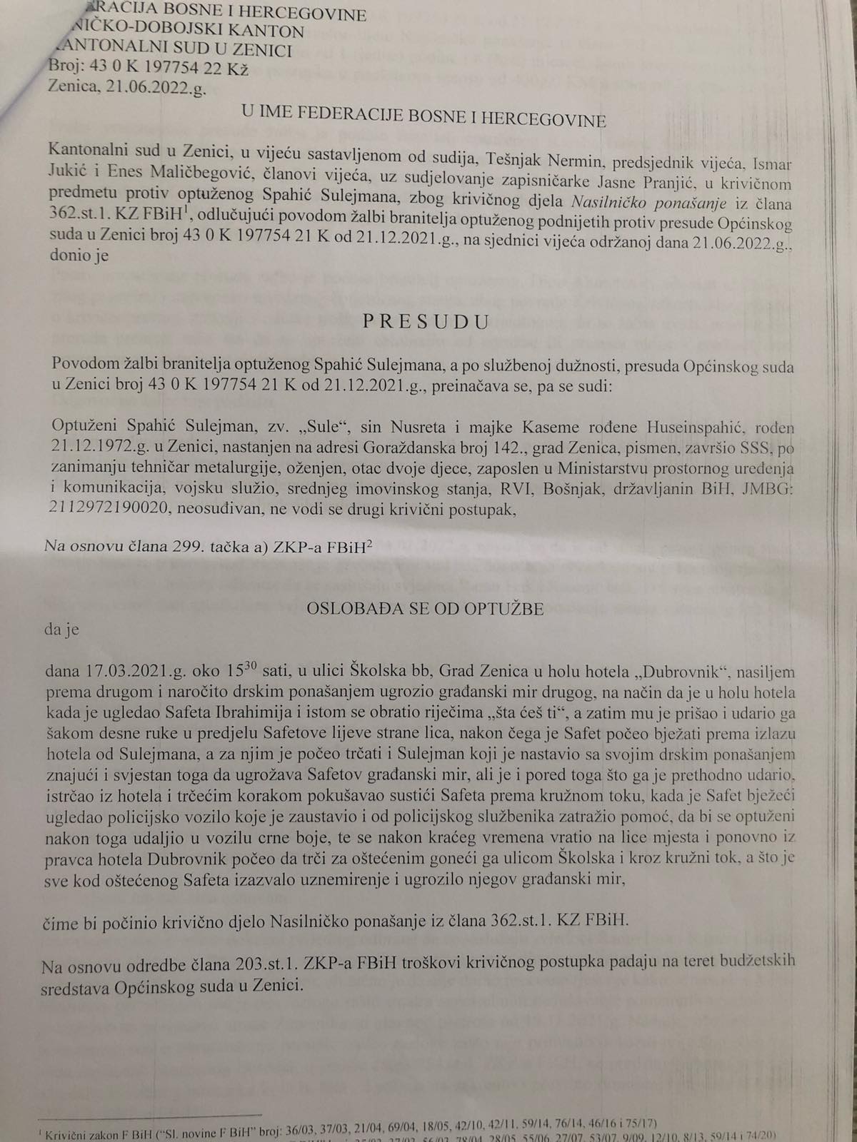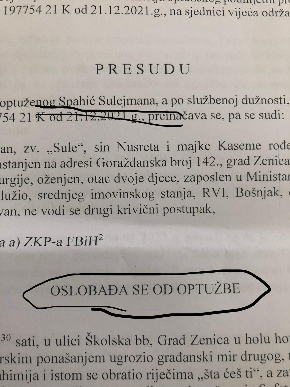 Naime, Kantonalni sud u Zenici je uvažio Spahićevu žalbu na presudu sudije Općinskog suda, Edvina Kokića, te ga oslobodio od optužbi za navodno krivično djelo nasilničko ponašanje, čime se samo još jednom potvrdilo da je u našoj zamlji pravda spora, ali itekako dostižna.