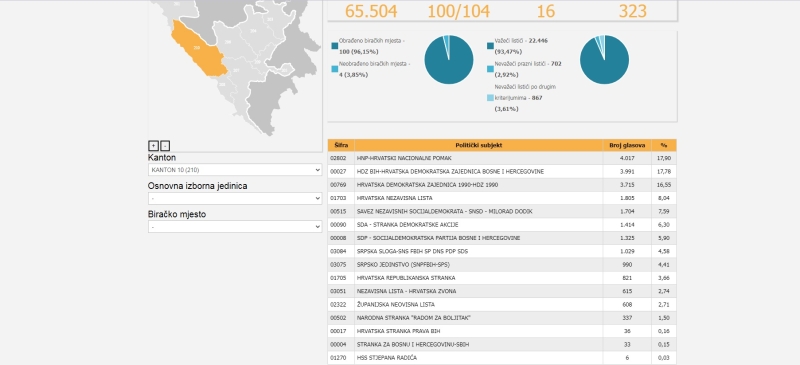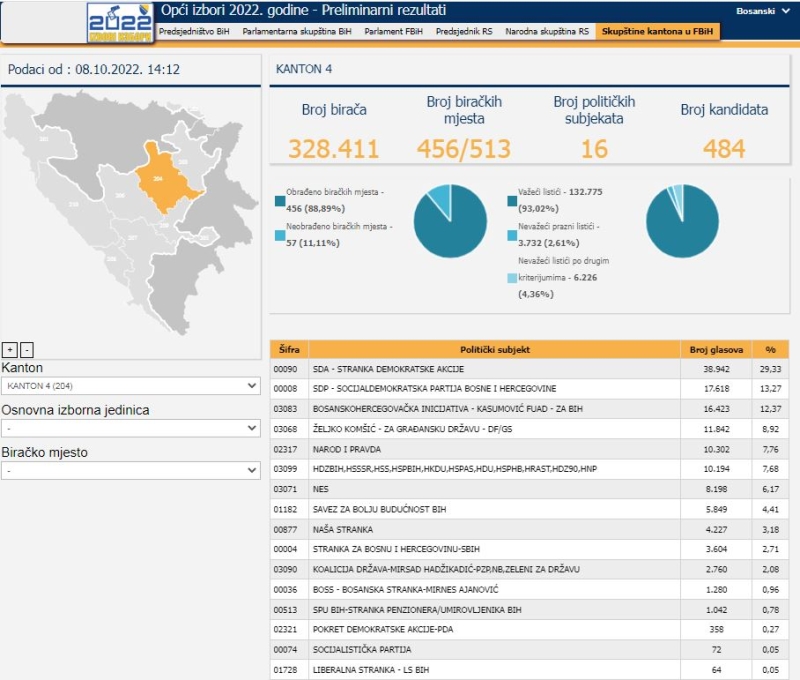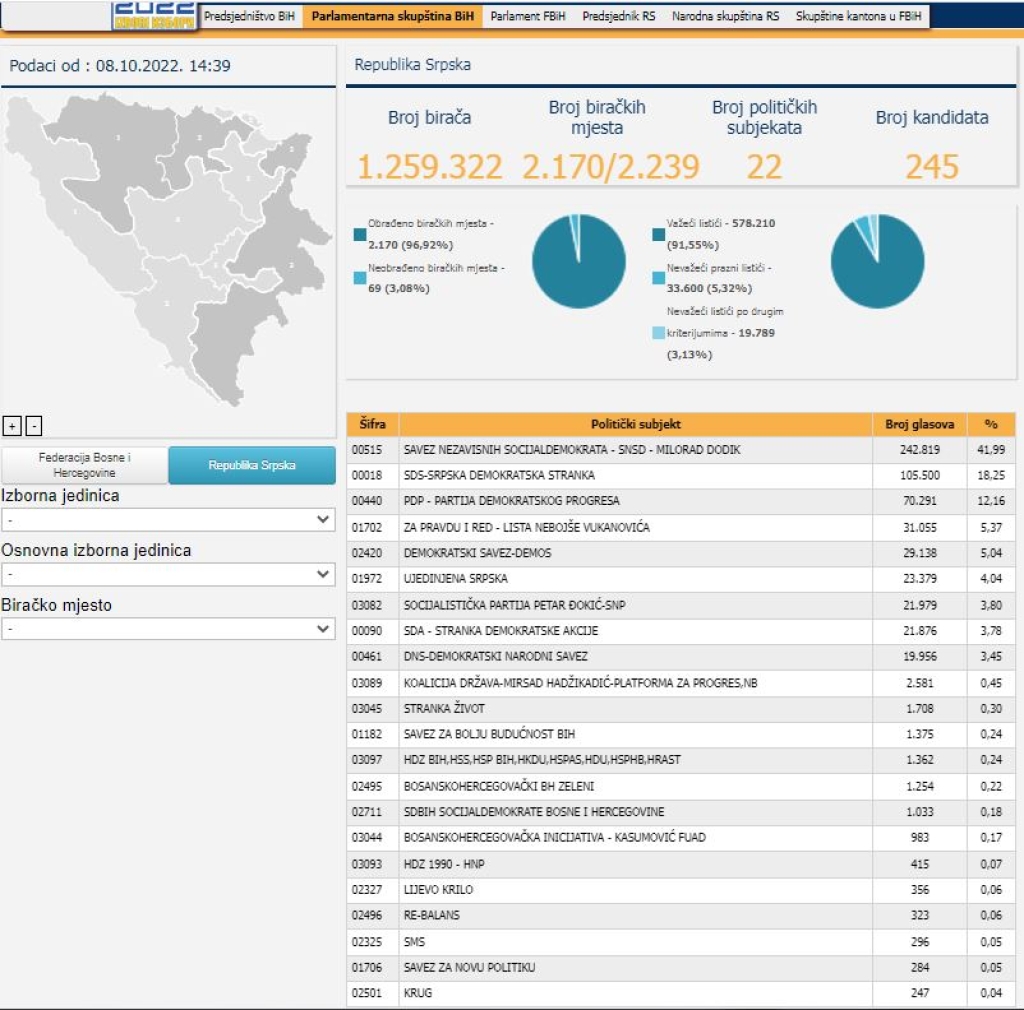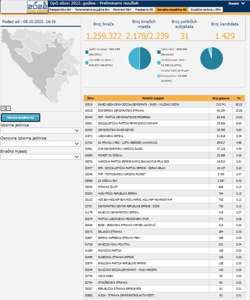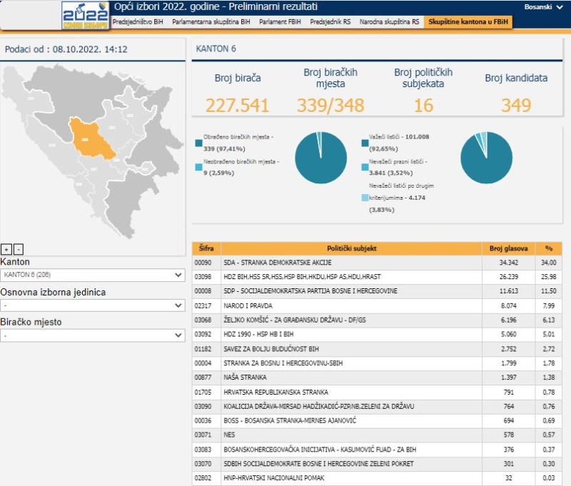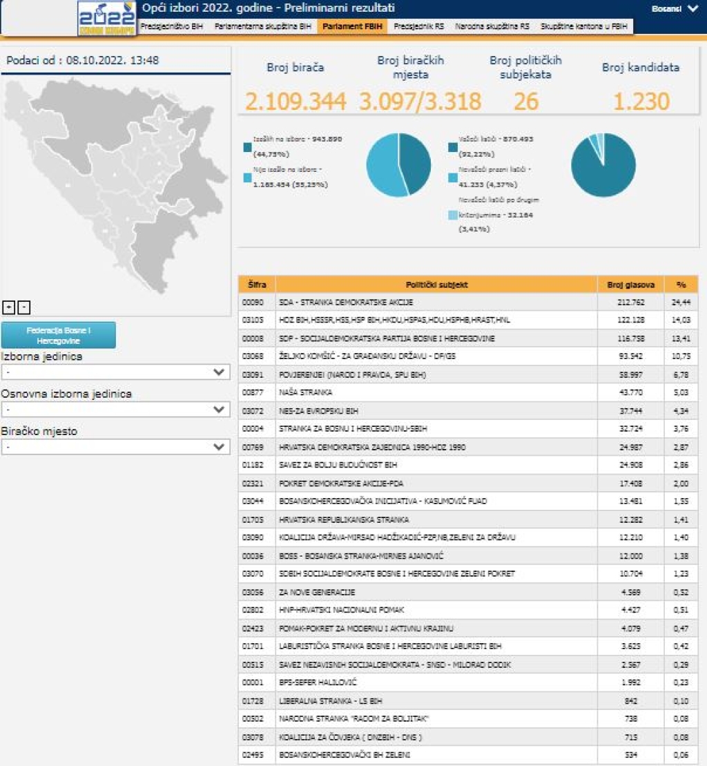 Centralna izborna komisija (CIK) Bosne i Hercegovine ažurirala je podatke preliminarnih rezultata Općih izbora održanih 2. oktobra ove godine.