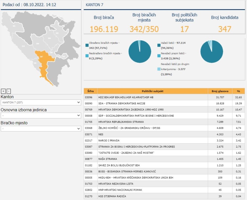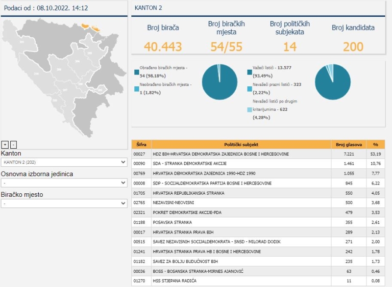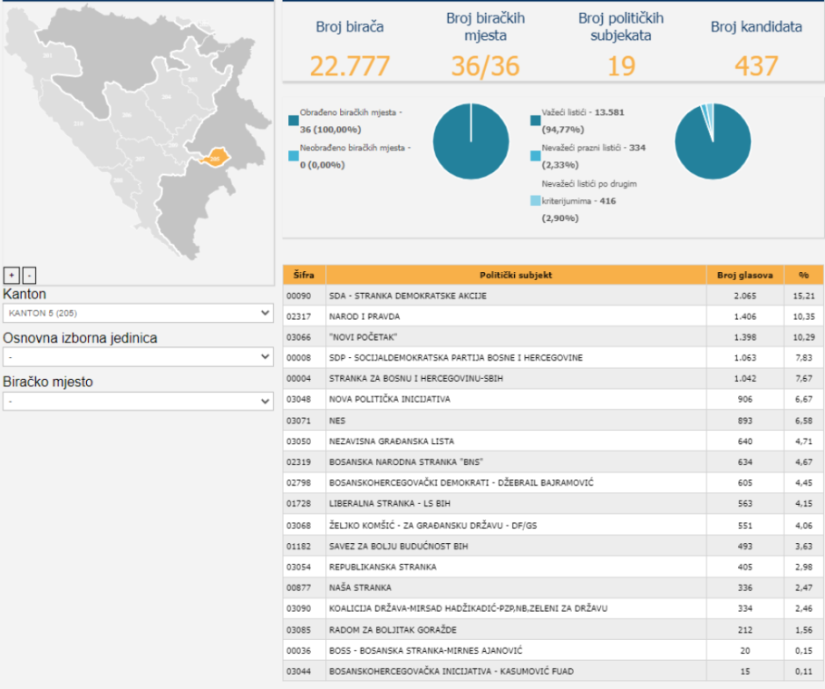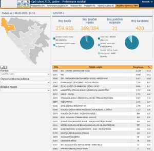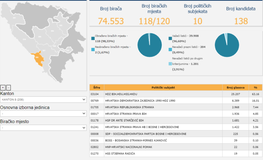 Kada su u pitanju kantoni, obrađeno je 93,93 posto biračkih mjesta.