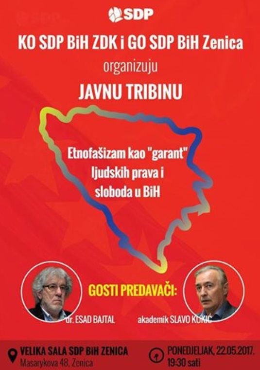 SDP: obavijest i poziv – Nakon što smo na rođendan grada Zenice 20.03. organizirali Javnu tribinu “BiH u kandžama globalizacijskih procesa”, na kojoj je gost predavač bio uvaženi profesor dr.Besim Spahić,ovaj put u Zenicu kao goste predavače predstavljamo dva ponajbolja bosanskohercegovačka politička analitičara,akademika Slavo Kukić i dr Esad Bajtal! Tema je više nego aktuelna za današnje vrijeme i političke procese u BiH- Etnofašizam kao “garant” ljudskih prava i sloboda u BiH !