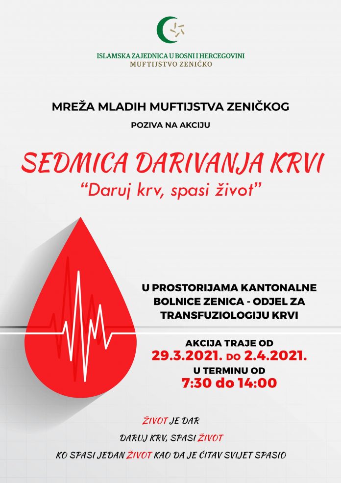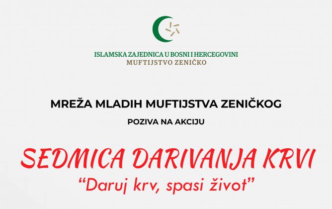 Sedmica darivanja krvi u organizaciji Mreže mladih Muftijstva zeničkog- Obavještavamo muslimane, članove i pripadnike Islamske zajednice, da Mreža mladih Muftijstva zeničkog u saradnji sa Transfuziologijom Kantonalne bolnice Zenica organizira akciju dobrovoljnog darivanja krvi.