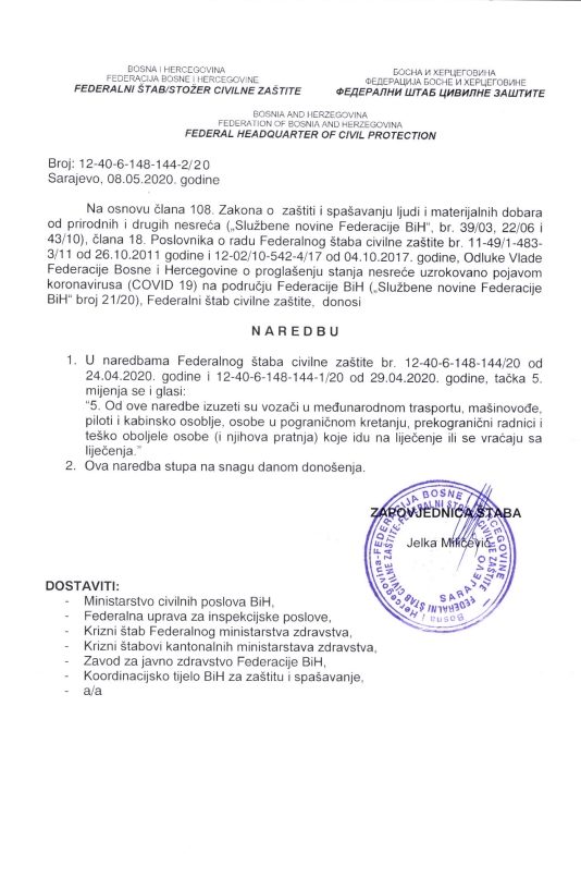 Današnjom naredbom tačka 5 naredbi od 24. i 29. aprila 2020. godine se mijenja i glasi da su “od ove naredbe izuzeti vozači u međunarodnom trasportu, mašinovođe, piloti i kabinsko osoblje, osobe u pograničnom kretanju, prekogranični radnici i teško oboljele osobe (i njihova pratnja) koje idu na liječenje ili se vraćaju sa liječenja.”