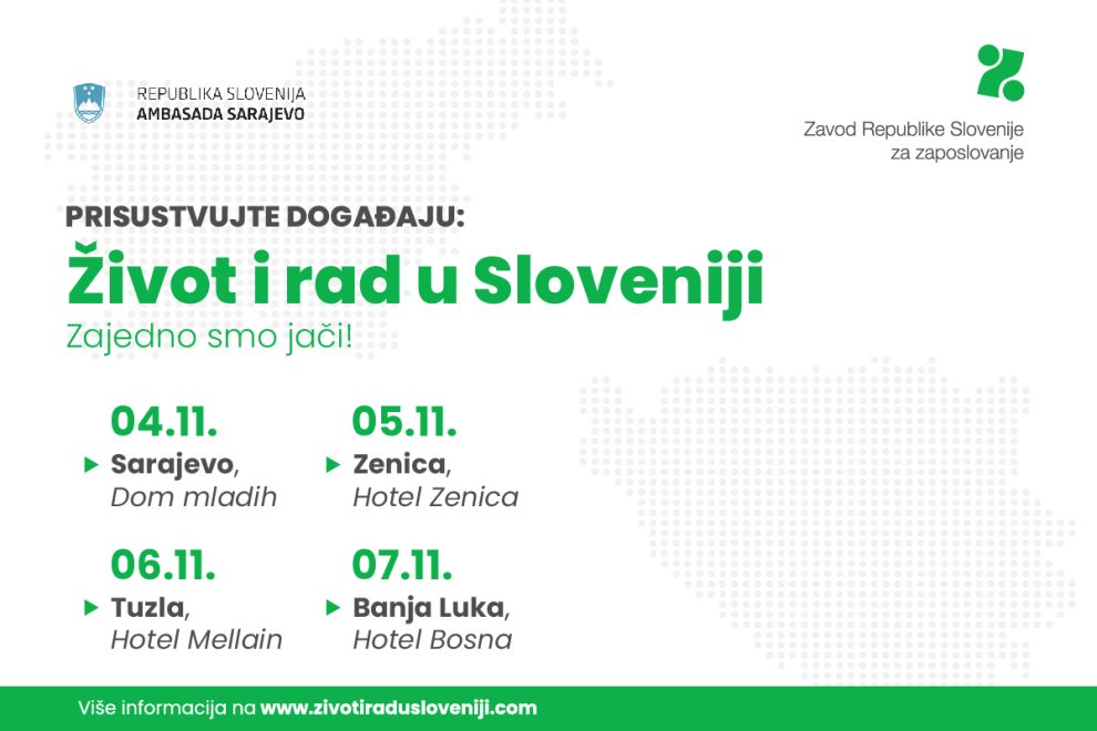 Nakon prošlogodišnjih uspješno organizovanih događaja u Bosni i Hercegovini pod nazivom Život i rad u Sloveniji, Zavod za zapošljavanje Republike Slovenije će u saradnji s Ambasadom Republike Slovenije u Sarajevu u prvoj sedmici novembra organizovati još četiri slična događaja na kojima će slovenski poslodavci imati priliku da se povežu s tražiteljima posla iz Bosne i Hercegovine. Učestvovat će oko 56 poslodavaca iz čitave Slovenije koji zapošljavaju skoro 19.000 radnika, najviše ih dolazi iz oblasti zdravstva i socijalne zaštite, transporta i skladištenja te građevinarstva.