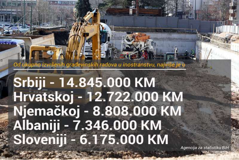 Od ukupno izvršenih građevinskih radova u inostranstvu u prvom polugodištu ove godine, najviše je radova u Srbiji, u vrijednosti 14.845.000 KM te Hrvatskoj u vrijednosti 12.722.000 KM. Slijede Njemačka, gdje je vrijednost izvršenih radova 8.808.000 KM, zatim Albanija (7.346.000 KM) i Slovenija (6.175.000 KM).