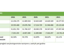 Vrijednost izvoza u 2022. je 18,4 mlrd. KM, što je više za 3,8 mlrd. KM ili 26 % u odnosu na 2021. godinu, a uvezena je roba u ukupnoj vrijednosti od 29,1 mrld. KM, što je povećanje od 7,2 mlrd. KM ili 33%. Vanjskotrgovinski deficit iznosio je 10,7 mlrd. KM.