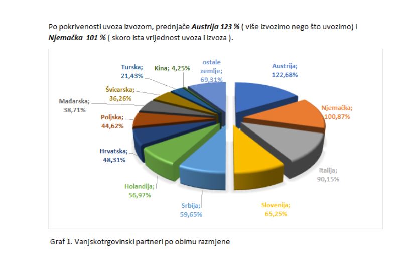 Najznačajniji bh. vanjskotrgovinski partner je Hrvatska. Ukupni obim razmjene s Hrvatskom iznosi 8 mlrd. KM, a nakon Hrvatske su Srbija (13,75 %), Njemačka (11,29%), Italija (8,88 %) i Slovenija (7,9 %). Po pokrivenost uvoza izvozom, prednjače Austrija (123%) i Njemačka (101%). Vodeći izvozni bh. proizvodi bili su električna energija (1,1 mlrd. KM), aluminij ( 878,5 mil. KM) i željezne ili čelične konstrukcije ( 630,8 mil. KM), dok smo najviše uvozili naftna ulja (3 mlrd. KM), aluminij (1,1 mlrd. KM) i kameni ugalj (919 mil. KM).