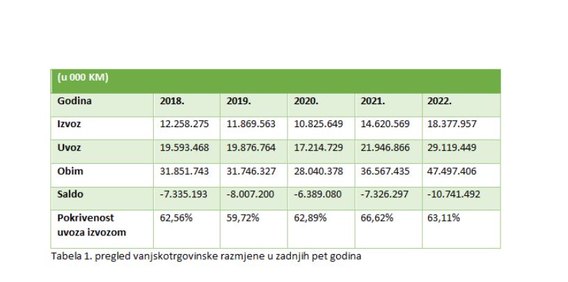 Vrijednost izvoza u 2022. je 18,4 mlrd. KM, što je više za 3,8 mlrd. KM ili 26 % u odnosu na 2021. godinu, a uvezena je roba u ukupnoj vrijednosti od 29,1 mrld. KM, što je povećanje od 7,2 mlrd. KM ili 33%. Vanjskotrgovinski deficit iznosio je 10,7 mlrd. KM.
