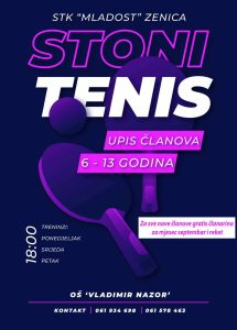Ovom prilikom pozivamo sve zainteresovane dječake i djevojčice uzrasti od 6 do 13 godina, da se upišu u “Školu stonog tenisa”.