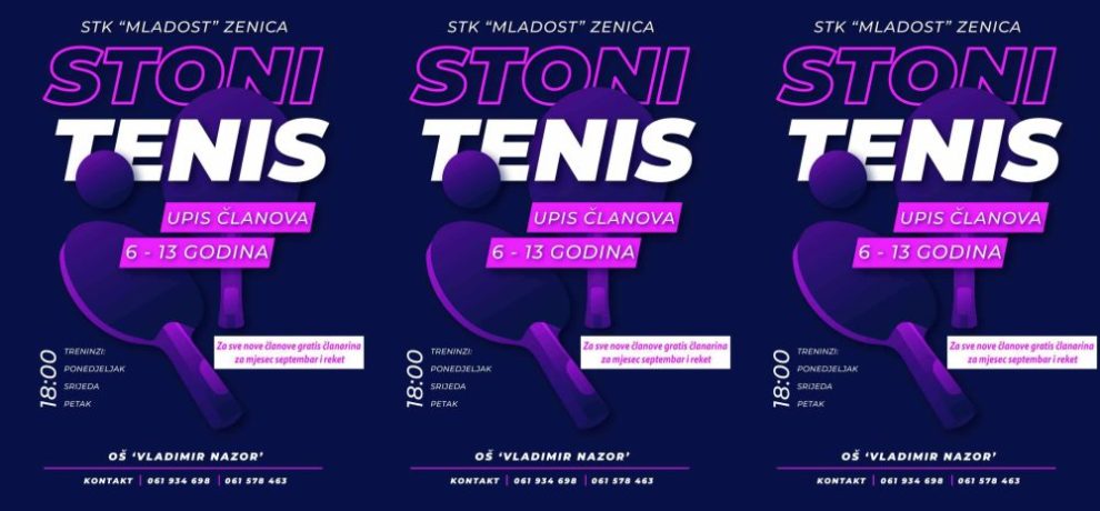 Za sve nove članove “Škole stonog tenisa” je besplatna članarina za prvi mjesec treniranja i stonoteniski reket za početnike.