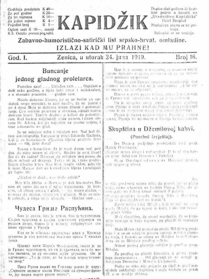 Prateći te trendove, autori primjećuju da je otvaranje novih štamparija impliciralo i pojavom novina, različitog žanra i periodike, koje su imale važnu ulogu u kreiranju javnog mišljenja ali i sakupljanju informacija o historiji Zenice, te navode primjer iz 1915. godine kada se u štampariji Adolfa Weissa štampa prvi zenički list pod imenom „Zenički list“, novine šaljivog karaktera (autori nemaju čvrstih dokaz za tu tvrdnju, recimo neki primjerak te novine, nego od ranije poznatu činjenicu prihvataju iz javnosti kao vjerovatnu). Sa sigurnošću se, međutim, za prvu novinu u Zenici može smatrati „Kapidžik“, list “zabavno-humorističko-satiričnog žanra“, koji je izlazio 1919. godine (i ćirilicom i latinicom) u štampariji Rafaela Trinkija. Obima prosječno četiri stranice, štampano je 17 brojeva, a izlazio je „kad mu se prahne“ i slovio listom srpsko-hrvatske omladine sa Nikolom Božićem na čelu kao urednikom a kasnije Jovom Marjanovićem. (O tom listu svojevremeno je pisao i zenički neumorni istraživač Mirsad Đulbić od koga sam pozajmio i naslovnicu 16. broja.)