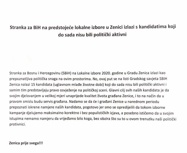 Stranka za BiH na predstojeće lokalne izbore u Zenici izlazi sa kandidatima koji do sada nisu bili politički aktivni