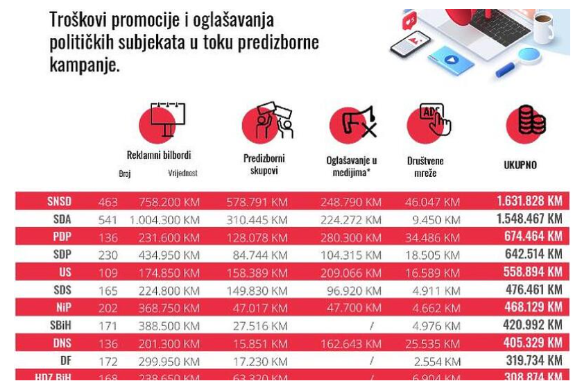 Kad se sve sabere, političke stranke su na tri oblika plaćenog oglašavanja i predizborne skupove do sada potrošile oko 9,6 milion KM, što je već sada više nego što su po podacima CIK-a sve stranke u BiH prijavile kao ukupne troškove kampanje za opšte izbore 2018. godine koji su iznosili 9,5 miliona KM.