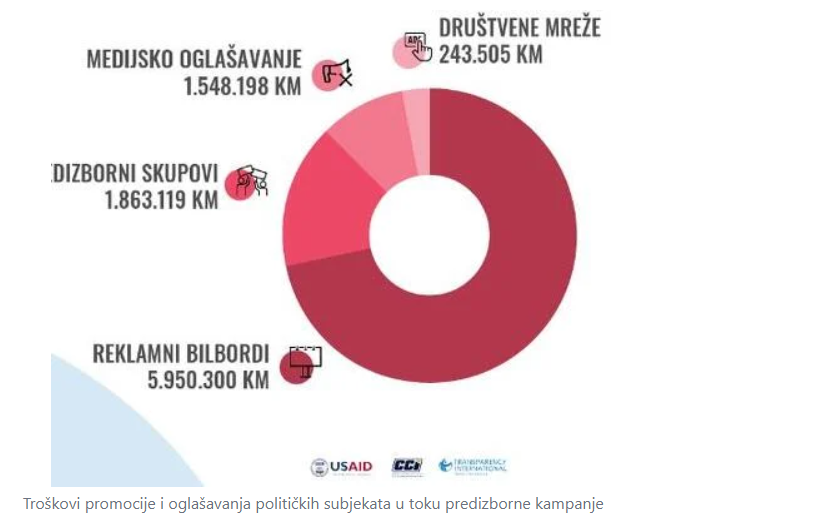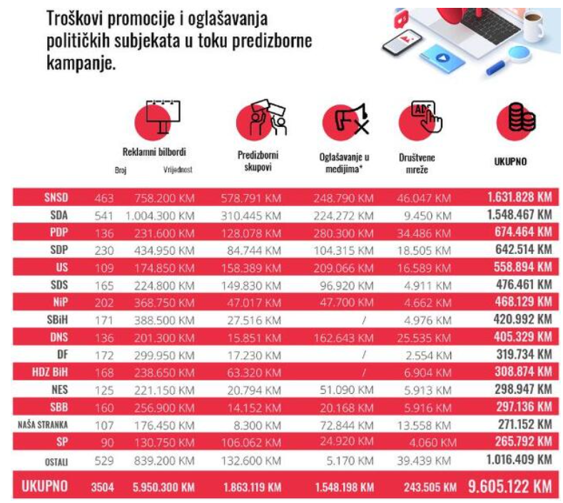 Kad se sve sabere, političke stranke su na tri oblika plaćenog oglašavanja i predizborne skupove do sada potrošile oko 9,6 milion KM, što je već sada više nego što su po podacima CIK-a sve stranke u BiH prijavile kao ukupne troškove kampanje za opšte izbore 2018. godine koji su iznosili 9,5 miliona KM.