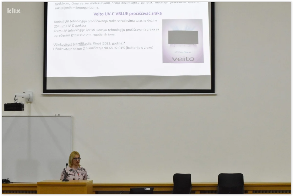 Jasmina Kišija-Bajrić u ime Zavoda za medicinu rada i sportsku medicinu ZDK danas je predstavila rezultate biološke efikasnosti UV-C pročišćivaća zraka uz obrazloženje da je njihovom upotrebom smanjen veliki broj bakterija i gljivica smanjen u prostorijama.