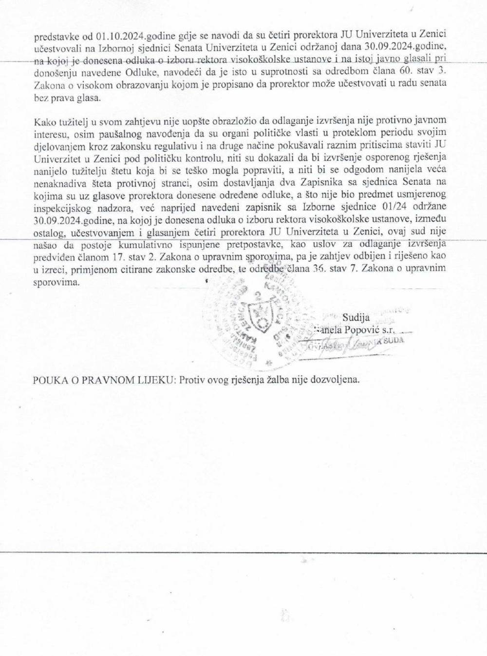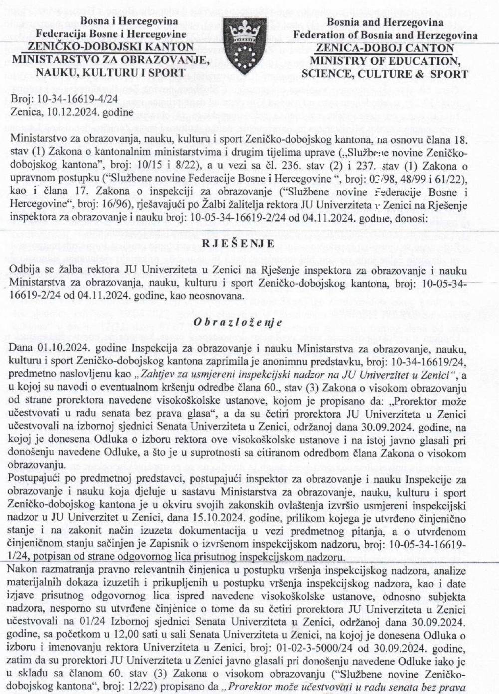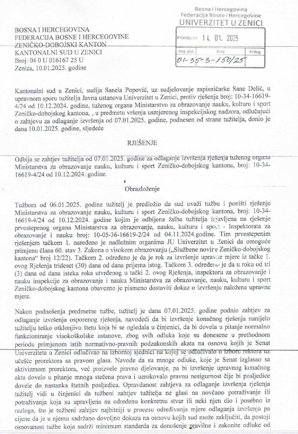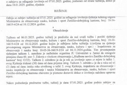 Kantonalni sud u Zenici je, postupajući u upravnom sporu tužitelja Javne ustanove Univerzitet u Zenici protiv tuženog Ministarstva za obrazovanje, nauku, kulturu i sport Zeničko-dobojskog kantona donio je Rješenje kojim se odbija zahtjev tužitelja za odgodu primjene Rješenja Ministarstva.