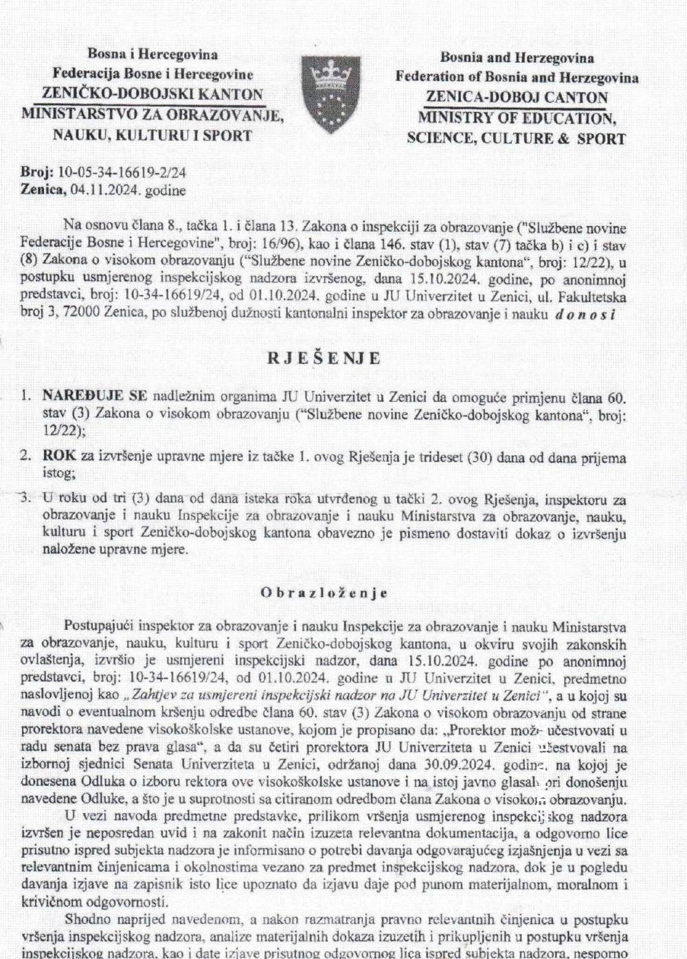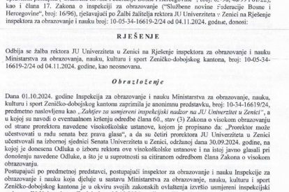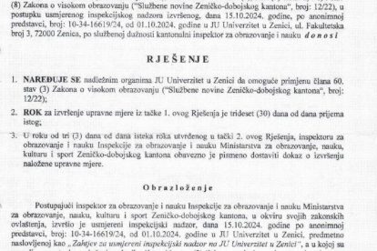 Naime, Univerzitetu Zenica je resorno ministarstvo Rješenjem od 4. novembra prošle godine naredilo da omogući primjenu člana 60. stav 3. Zakona o visokom obrazovanju, te dostavi dokaz o izvršenju naložene upravne mjere.