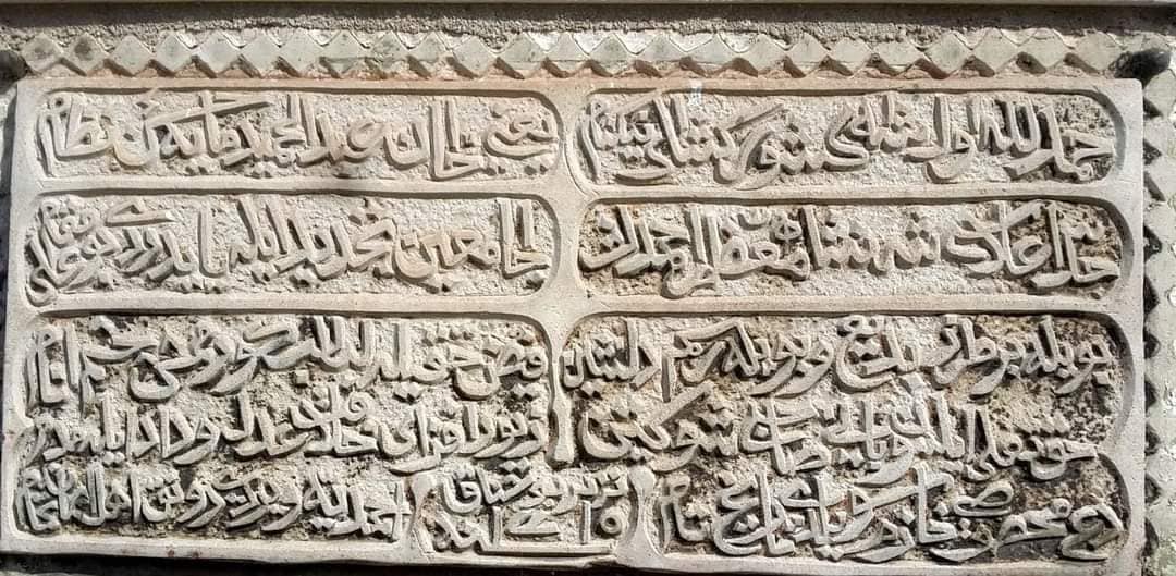 U tekstu se spominje datum izgradnje džamije, kao i to da se izgradila na temeljima ranije Šehinšah Ahmedove džamije (Sultan Ahmedove), koji ju je vjerovatno obnovio na temeljima ranije džamije, sagrađene početkom 18. vijeka, oko 1730. godine, a porušene od strane Eugena Savojskog 1697. godine.