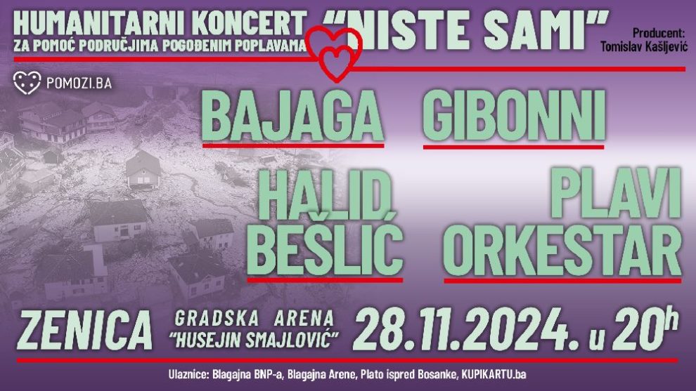 U zeničkoj Areni sutra u će biti održan humanitarni spektakl „Nismo sami“, a kompletan prihod od prikupljenih sredstava bit će namijenjen za žrtve katastrofalnih poplava koja su pogodile Bosnu i Hercegovinu.