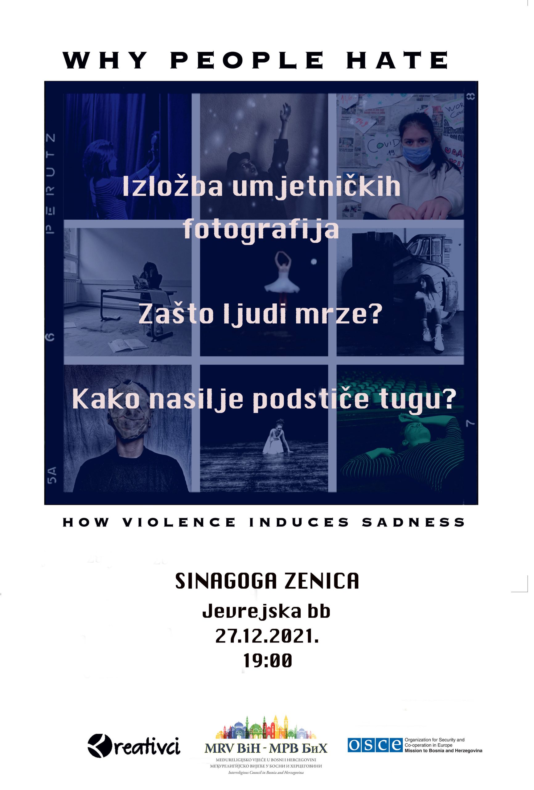 U organizaciji Odbora za međureligijsku saradnju Zenica i Novi Travnik, Misije OSCE-a i Udruženja “Kreativnici” bit će upriličeno otvorenje izložbe naziva “Why people hate? – Zašto ljudi mrze?” u ponedjeljak 27.12.2021. godine u zeničkoj Sinagogi s početkom u 19 sati.