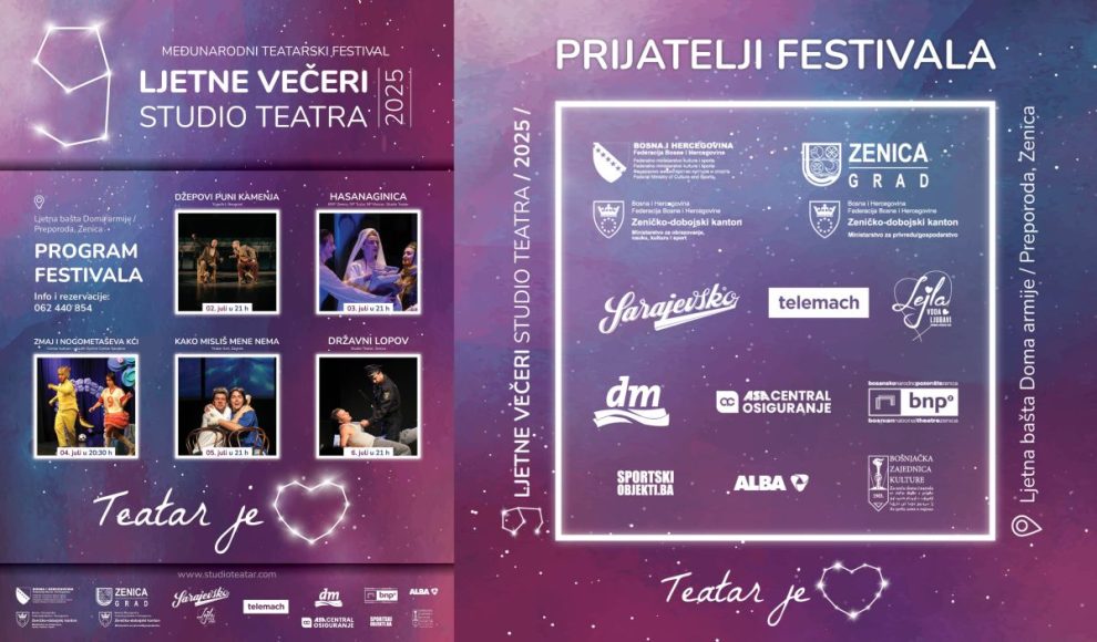 Ovogodišnji festival sa sloganom Teatar je ljubav, ukupno će trajati pet noći, a publika će imati priliku da uživa u četiri predstave za odrasle i jednoj predstavi za djecu. Drugu noć na festivalu igra predstava „Hasanaginica“ nastala u koprodukciji Bosanskog narodnog pozorišta Zenica, Narodnog pozorišta Mostar, Narodnog pozorišta Tuzla i Studio Teatra. Autor dramskog teksta je Mirza Begović, dok je režiju radio Irfan Kasumović. U predstavi igraju: Adna Kaknjo, Irfan Kasumović, Nusmir Muharemović, Remira Osmanović, Emir Sejfić, Mirza Ćatibušić, Zerina Mujkić i Nermin Hodžić. Treća noć festivala Ljetne večeri Studio Teatra rezervisana je za najmlađu publiku, koja će nakon igraonica, radionica i plesnih zabava uživati u predstavi „Zmaj i nogometaševa kći“ u produkciji JU Centar kulture i mladih Općine Centar Sarajevo, a po tekstu Mirsada Bećirbašića. U predstavi igraju: Armin Omerović, Ana-Marija Tomić i Senad Bostandžić. U subotu, 05. jula i četvrte festivalske večeri, publici će se predstaviti Teatar Exit Zagreb sa hit predstavom „Kako misliš mene nema?!“, u kojoj igraju Filip Juričić i Amar Bukvić. Festival, kao i prethodnih osam izdanja, zatvara hit komedija Studio Teatra „Državni lopov“ nastala po tekstu Fadila Hadžića, a u kojoj igraju Nusmir Muharemović, Irfan Kasumović i Mirza Mušija.