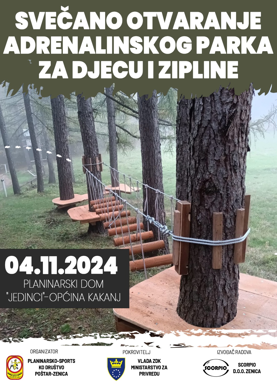 Danas (04.11.2024) su članovi planinarsko-sportskog društva “Poštar” Zenica organizovali simbolično svečano otvaranje adrenalinskog parka za djecu i zipline u blizini planinarskog doma “Jedinci” na planini Hum ( općina Kakanj).