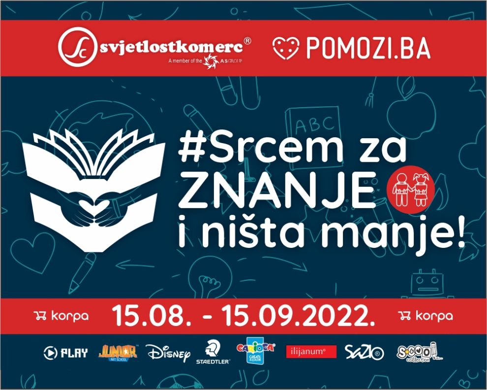 Društveno odgovorna kampanja „Srcem za znanje i ništa manje“ realizirat će se u periodu od 15.08. do 15.09.2022. godine. U navedenom periodu, građani će kupovinom u Knjižarama SVJETLOST i kupovinom brendova koje distribuira kompanija Svjetlostkomerc u hipermarketima Bingo, Mercator i Konzum, te narudžbama preko platforme Korpa.ba, kroz opremanje svojih školaraca direktno učestvovati u obezbjeđenju uslova boljeg i lakšeg obrazovanja djeci socijalno ugrožene kategorije.