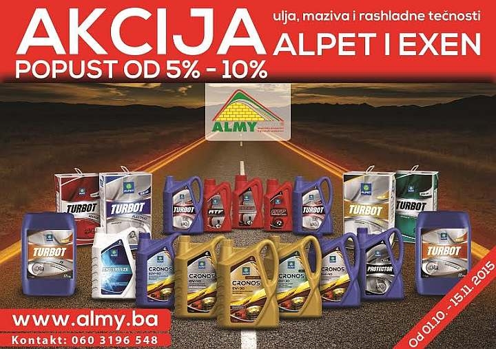 Cijenjeni kupci kompanije Almy, iskoristite sniženja do 10% na sve artikle Alpet i ExEn motornih ulja, maziva i rashladnih tečnosti na našim benzinskim pumpama...