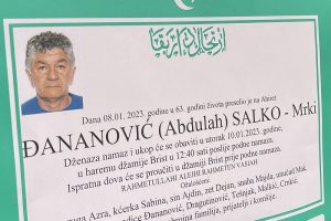 Dženaza namaz Salki (Abdulaha) Džananoviću i ukop obaviće se sutra (utorak) 10. januara, u haremu džamije Brist, u 12.40 sati, poslije Podne namaza, gdje će se...