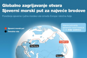 Infografika: Globalno zagrijavanje otvara Sjeverni morski put – Plovidba sjevernom pomorskom rutom kraća je za do dvije sedmice i šest hiljada kilometara.