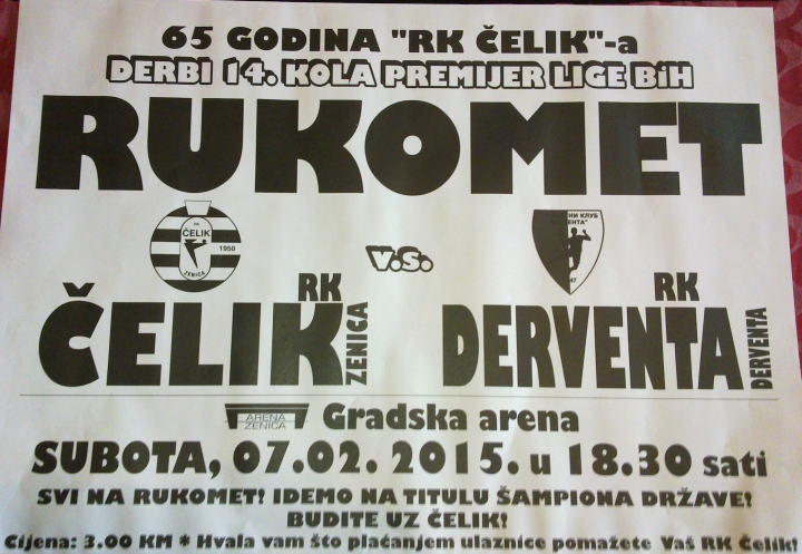 POZIV IZ RK ČELIK. SVI NA VELIKI DERBI. RUKOMETNI DERBI U GRADSKOJ ARENI ČELIK – DERVENTA (subota u 18,30 h). „Rezultat je neupitan: mi RK ,,Derventu”...
