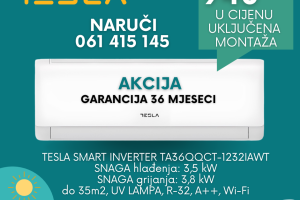 Iskoristi priliku, najpovoljniji uvjeti, najniže cijene i uračunata montaža! TESLA SMART INVERTER TA36QQCT-1232IAWT SNAGA hlađenja: 3,5 kW SNAGA grijanja: 3,8...
