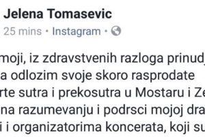Zbog bolesti pjevačice otkazani koncerti Jelene Tomašević u Zenici i Mostaru Jelena Tomašević koja je imala zakazan koncert u Zenici 18.12.2017., zbog...