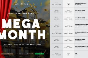 MEGA MONTH u Motelu Almy!- MEGA MONTH U MOTELU ALMY – OD 01.11. DO 30.11.2023. GODINE Dragi naši, u mjesecu novembru Vas očekuju razna iznenađenja u...