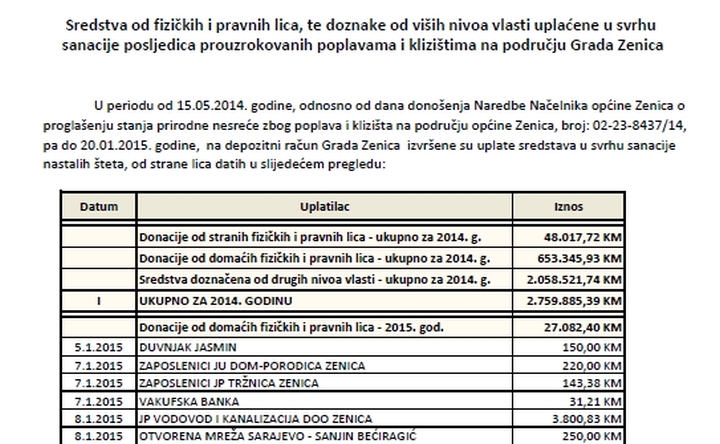 U periodu od 15. maja 2014. godine do 20. januara 2015. godine na depozitni račun Grada Zenica uplaćeno je ukupno 2.971.758,76 KM. Sredstva su donacije...