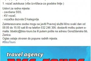 Privatna autoprijevoznička kuća Biss Tours jutros je na svojoj stranici na društvenoj mreži Facebook objavila konkurs za prijem više vozača za vožnju na...