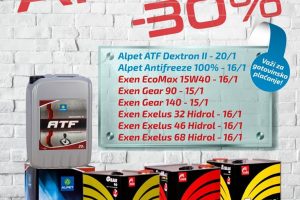 Cijenjeni kupci kompanije Almy, iskoristite sniženja do 10% na sve artikle Alpet i ExEn motornih ulja, maziva i rashladnih tečnosti na našim benzinskim pumpama...