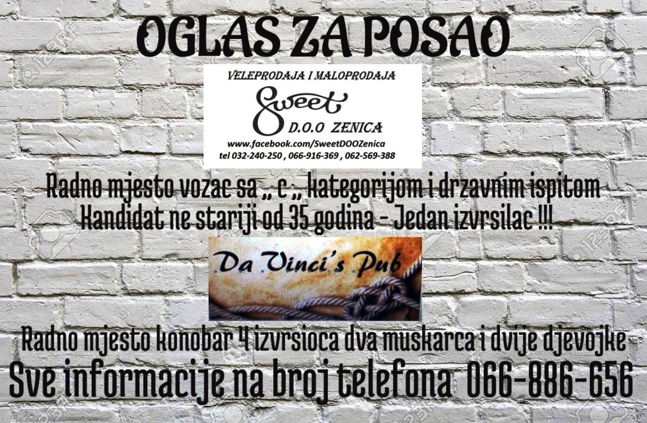 POPUNJENO – SPISAK KANDIDATA JE ZAKLJUČEN OGLAS VIŠE NIJE VALIDAN, OBAVJEŠTAVAJU IZ SWEET.d.o.o. Posao: vozač i konobari (Sweet/Da Vinci’s pub)...