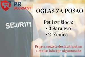 Agencija za zaštitu ljudi i imovine Pr Sigurnost traži pet zaštitara na poslovima fizičke zaštite: 3 Sarajevo 2 Zenica Prijave se mogu slati na e-mail info@pr...