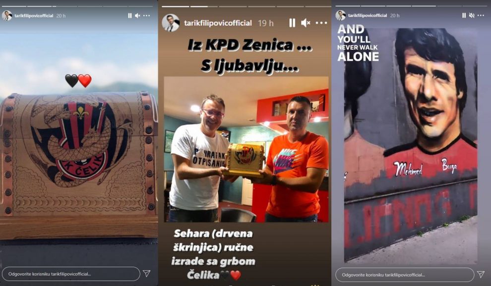 “Milijunska ekipa, realno”, napisao je Amel u komentaru. “Kraljica i dva cara”, “Lijepi ste, ali dama vas je zasjenila”, “Svoj na svome, ništa ljepše”, “Svaka čast, sjajno”, još su neki od komentara. Tarik je otkrio i da je dobio poklon s grbom zeničkog nogometnog kluba Čelik. “Iz KPD Zenica s ljubavlju”, napisao je uz fotografiju na kojoj mu prijatelj uručuje škrinjicu. “Sehara (drvena škrinjica) ručne izrade s grbom Čelika”, napisao je Tarik i dodao dva srca u bojama tog nogometnog kluba, piše zagrebački Index.hr.