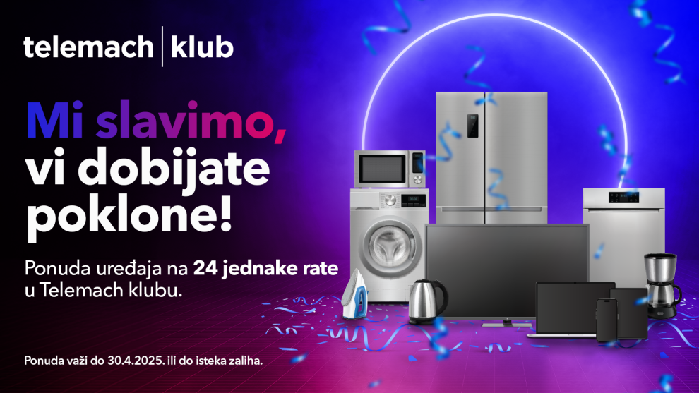 Istražite pogodnosti slavljeničke akcije Telemach kluba, koja traje do 30. aprila, i priuštite sebi vrhunske uređaje: televizore, pametne telefone, laptope, IT opremu, kućanske aparate poput veš mašine i klime, pametne satove, gadgete i druge uređaje. Ako koristite usluge kompanije Telemach BH po punoj cijeni godinu dana ili duže i redovno izmirujete svoje mjesečne račune, ostvarujete pravo na kupovinu jednog uređaja iz navedene ponude – uz obnovu ugovora ili prelazak na veći paket, s ugovornom obavezom na 24 mjeseca.
