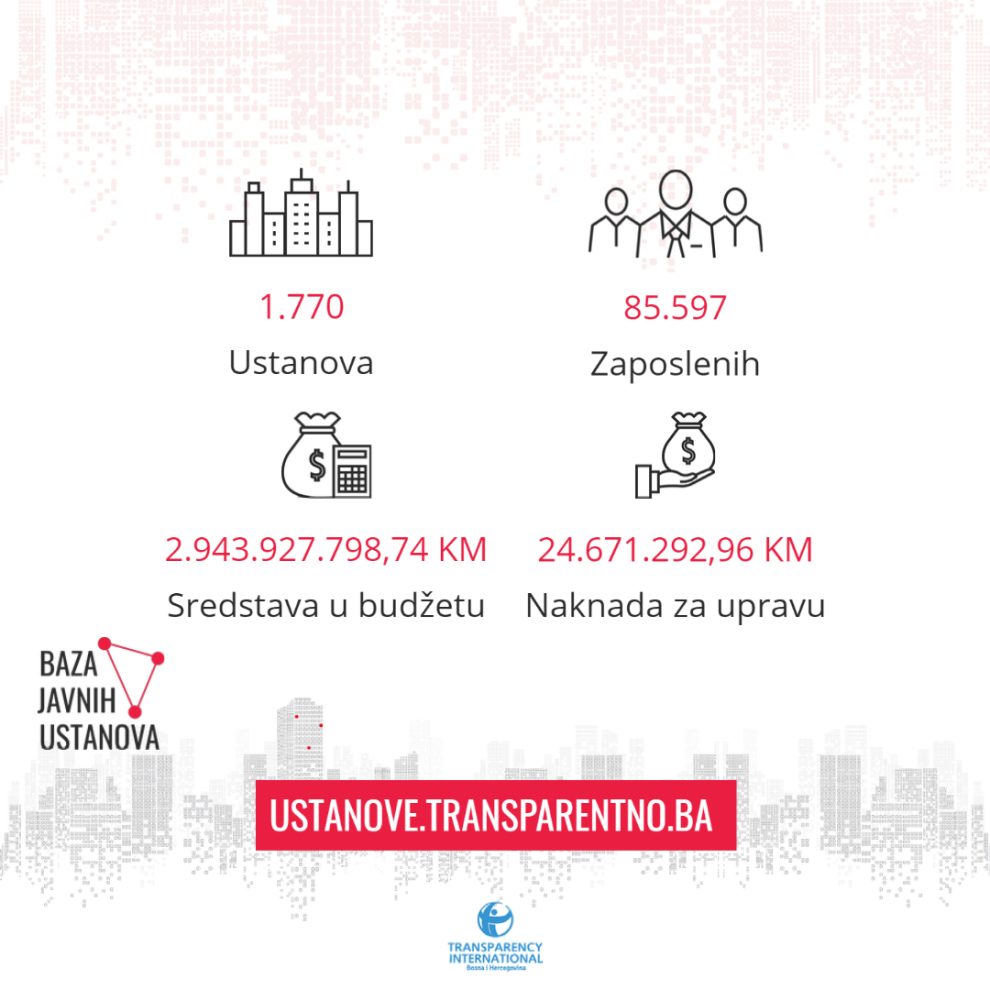 Baza javnih ustanova u BiH – informacije o javnim ustanovama sa podacima o broju zaposlenih, budžetima i iznosima naknada za članove upravljačkih struktura na svim nivoima u Bosni i Hercegovini.