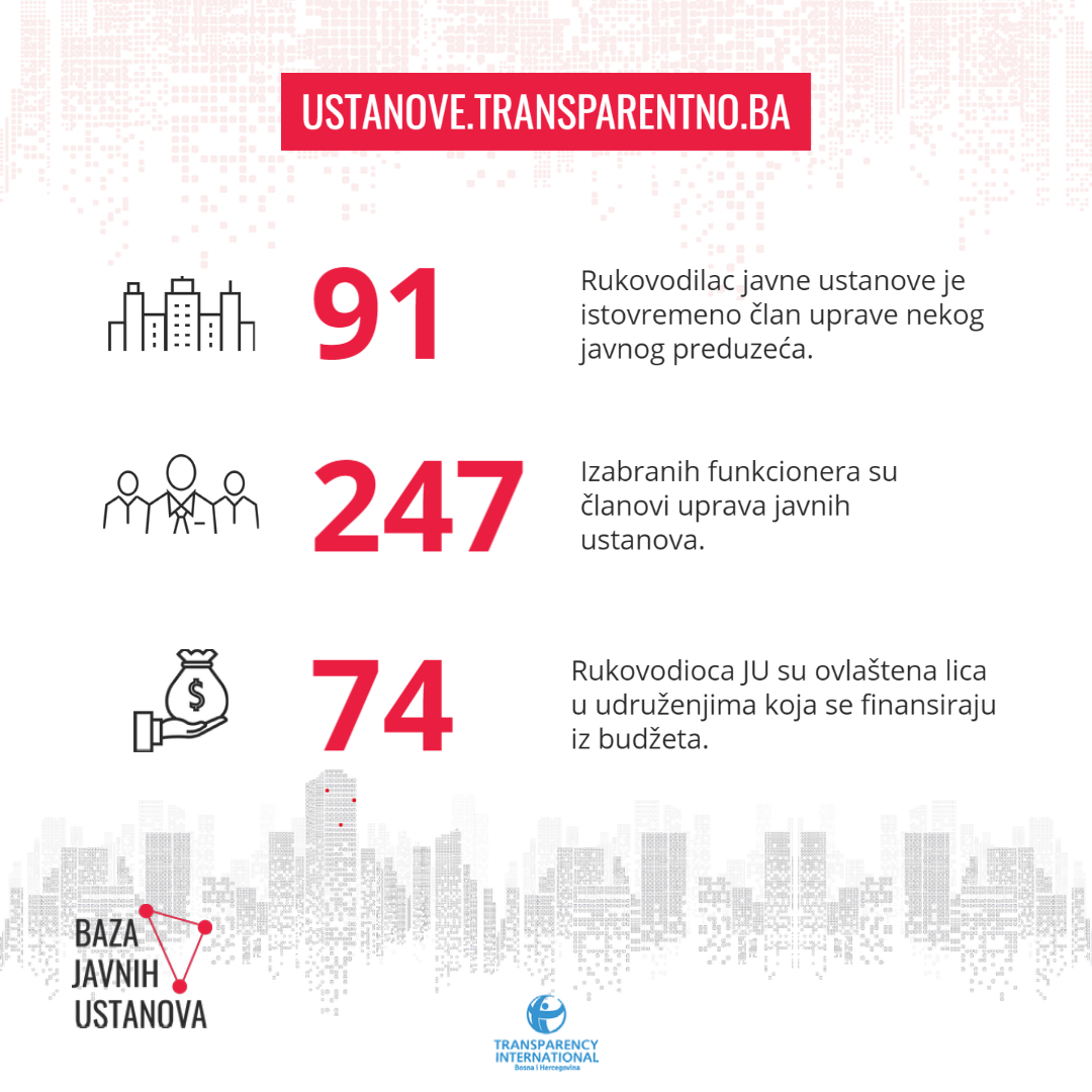 U BiH ne postoji registar javnih ustanova, a objavljivanjem podataka o njihovom poslovanju i sastavu članova uprave, TI BiH je identifikovao brojne rukovodioce na dvostrukim funkcijama, od kojih su neki po važećim propisima u direktnom sukobu interesa.
